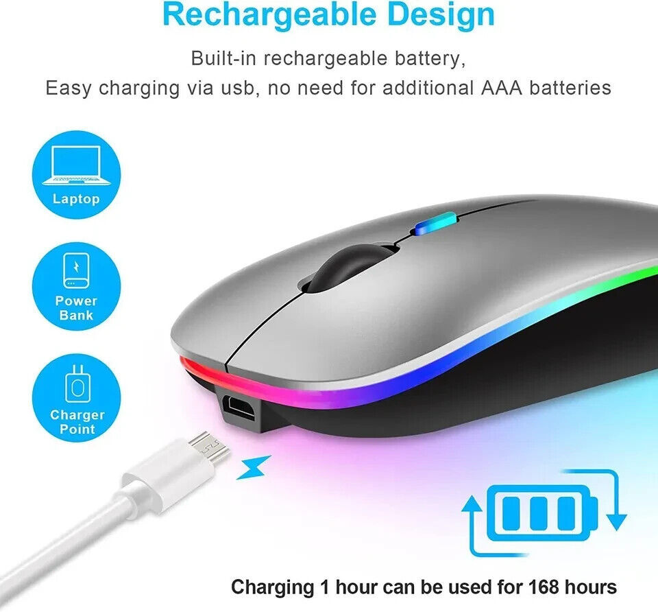 Slim Silent Rechargeable Wireless Mouse RGB LED USB Mice MacBook Laptop PC